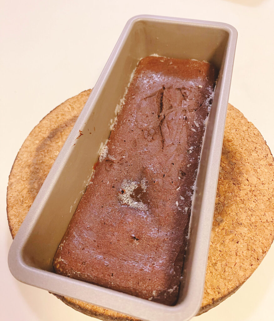 本当は円形のホール型がいいのですが、なかったので。ミートローフやテリーヌを焼くときの型で焼き上げました。