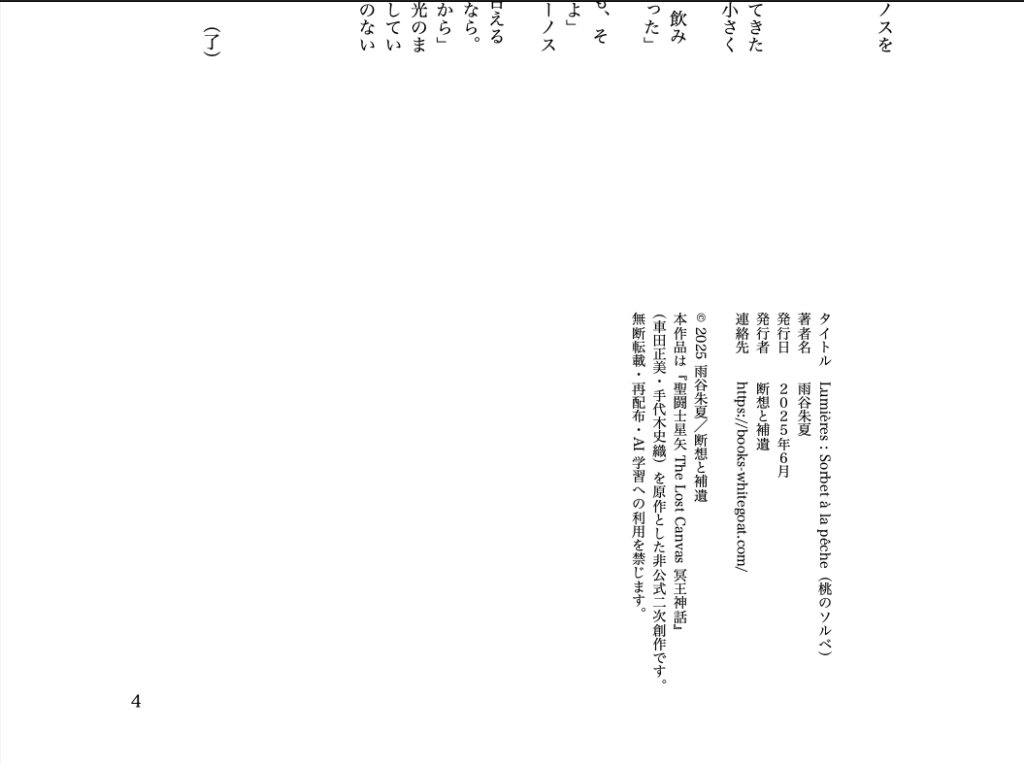 例:”本作品は『聖闘士星矢 The Lost Canvas 冥王神話』(車田正美・手代木史織)を原作とした非公式二次創作です。無断転載・再配布・AI学習への利用を禁じます。”